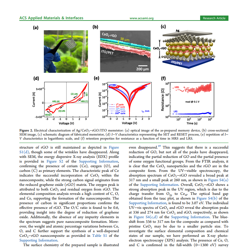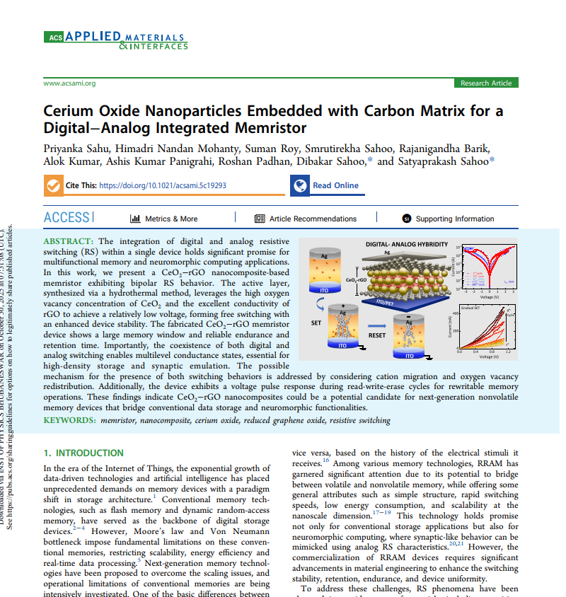Congratulations!! Our recent manuscript entitled “Cerium Oxide Nanoparticles Embedded with Carbon Matrix for a Digital-Analog Integrated Memristor“, Priyanka Sahu, Himadri Mohanty, S. Roy, Smrutirekha Sahoo, R. Barik, Alok Kumar, A. Panigrahi, R. Padhan, D. Sahoo, S. Sahoo is accepted in ACS Applied Materials & Interfaces, 2025.