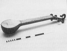 India (east), Bangladesh body: wood, with goat skin over the front face; L. 81.5cm strings: 4, brass and steel tuning: g-c' -c' -f" The player sits cross-legged and holds the instrument across the body. The strings are plucked near the bridge with a plectrum held in the right hand. Played primarily in accompaniment of folk song and baul, religious songs of itinerant priests. The name means "two strings". Melodies are played mostly on the third and fourth strings. http://www.geidai.ac.jp/~odaka/gcat/index-e.html |